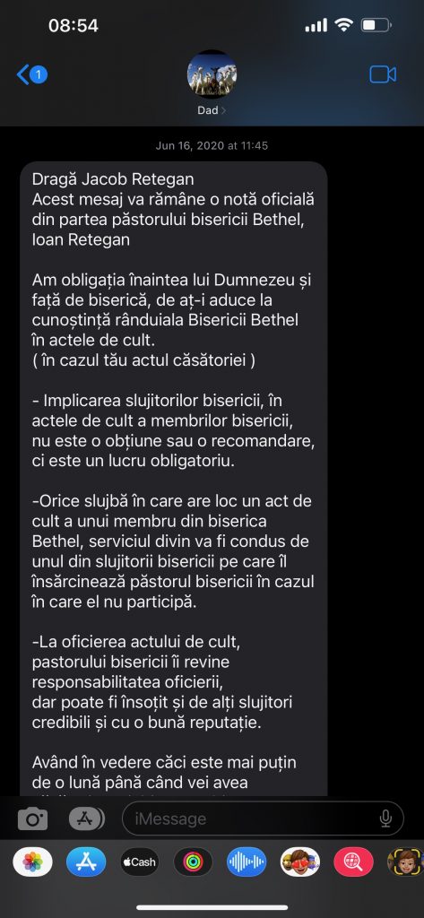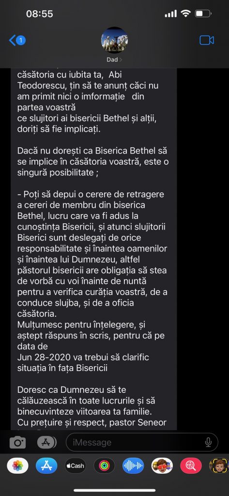 The day of the wedding, Ioan (Ionuc) Retegan pulled aside the officiating minister that Abigail and Jacob had chosen, and implied to him that the couple had had sexual relations prior to marriage, a mere five minutes before the ceremony was supposed to start. The minister in question, Teo Costea (from Phoenix, Arizona), went directly to the couple and asked them before the Lord if the allegations were true, relaying it was Jacob’s father that had just informed him of this. The couple explained that they were not. To which the minister, Teo Costea, revealed he knew the allegations were NOT true because the Lord had revealed the truth to him. However, he explained to the couple, so that man cannot say that he did not do his due diligence, he had to question the couple about the allegations Ionuc Retegan had made.