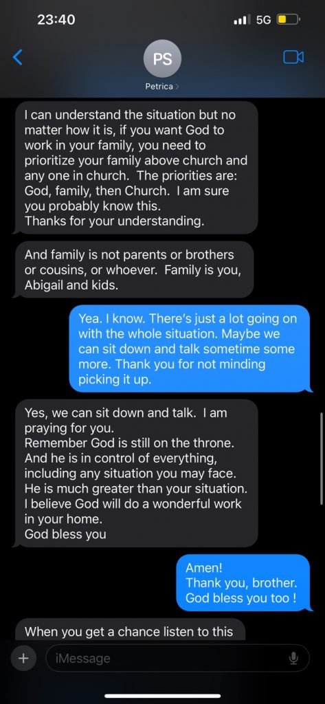 Ionuc proceeded to insist on the family group chat that he be allowed to meet with each individual couple separately (Jacob with Abigail, Rachel with Nathan, JD with Ella). Abigail and Jacob refused this, as did Nathan and Rachel, knowing that in doing so, this would enable Ionuc to manipulate the individual conversations once again and twist the narrative to save his own image. Both couples expressed they wished to meet and discuss the issues at hand with the WHOLE family present. Ionuc once again refused, citing Biblical passages, that he intentionally left portions out of to fit his argument.