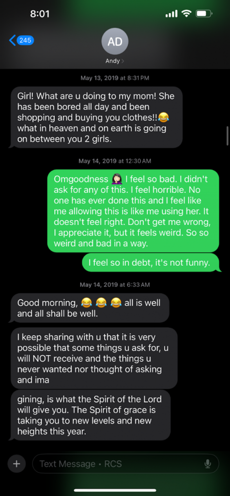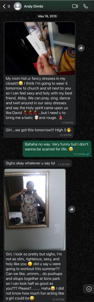 Context: Andy Dimbi messages Abigail Teodorescu regarding dresses Ana Dimbi had purchased for her. He states his mother hid them away in his closet [as she did not want her husband to be aware of the purchases]. Andy sends a picture of the tag from one of the dresses to Abigail, stating he would like to down a sexy dress alongside her in church, and “pray, sing, dance and twirl around in our sexy dresses and say the Holy Spirit came upon us like David…” Andy then forwards a picture of himself posing with said dress in front of a mirror with the message, “Girl, I look so pretty but sighs, I’m not as slim, righteous, sexy, and holy like you [emoji] did you say [you] were going to workout this summer??…”