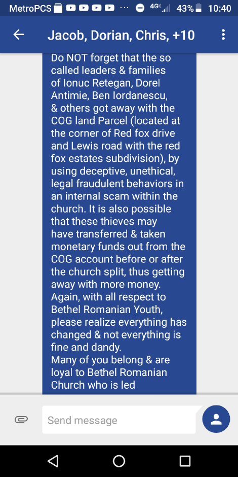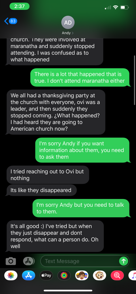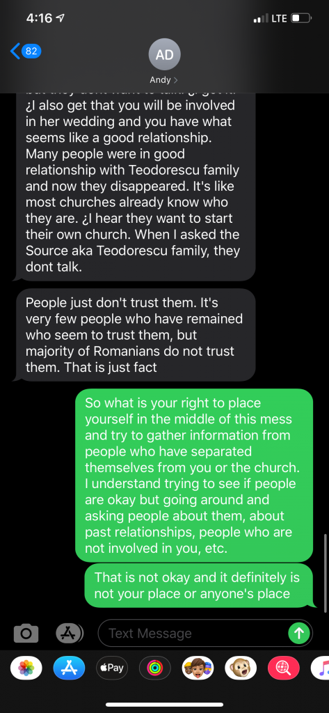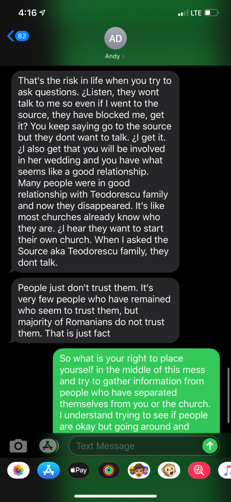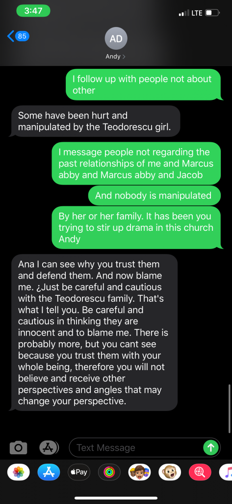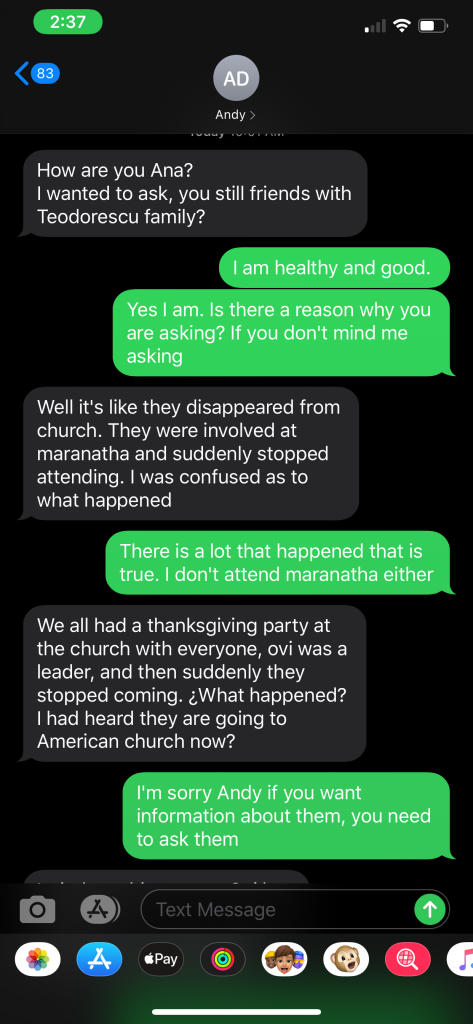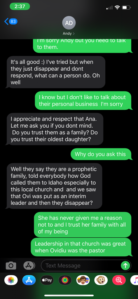 Ovidiu Teodorescu had begun gathering in his living room with his family, where two or three families were gathering along with them to worship and praise the Lord without the influence of the corruption taking place in Nampa. When Andy Dimbi’s tactics failed with regard to this “official letter”, he once again resorted to reaching out to the youth of the community. He began messaging specific individuals within the group of people that were gathering with the Teodorescu family for praise and worship.