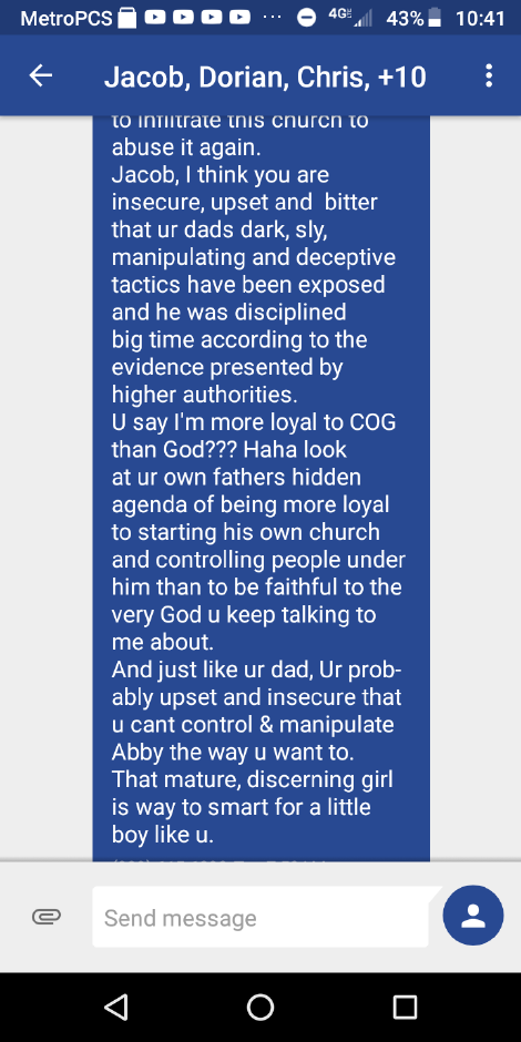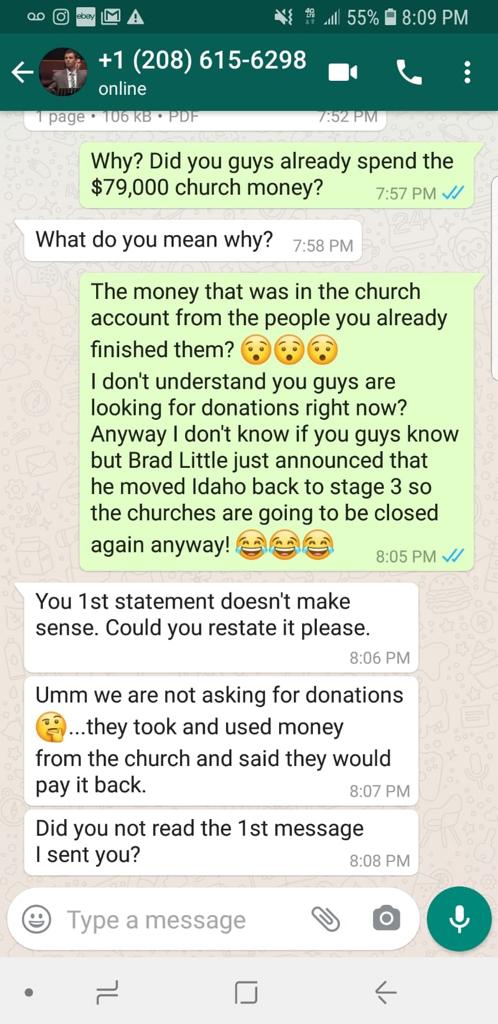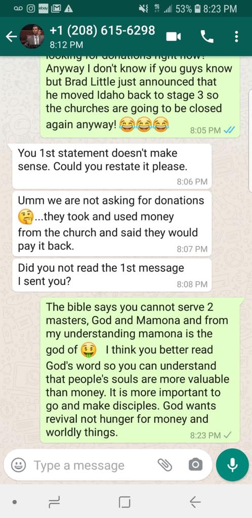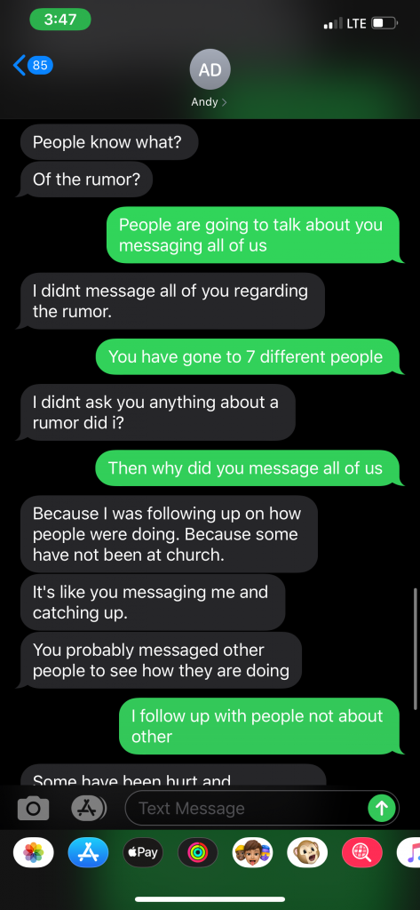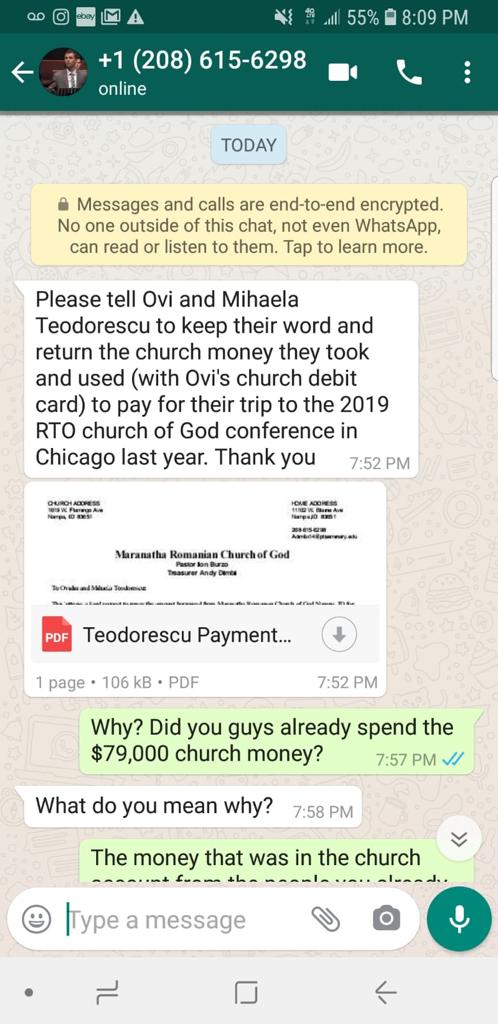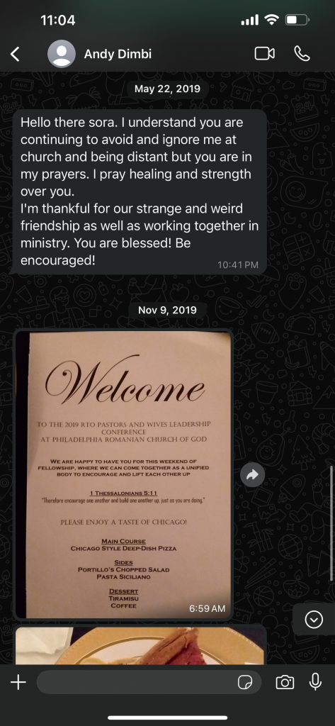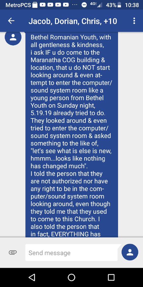 Ovidiu Teodorescu had begun gathering in his living room with his family, where two or three families were gathering along with them to worship and praise the Lord without the influence of the corruption taking place in Nampa. When Andy Dimbi’s tactics failed with regard to this “official letter”, he once again resorted to reaching out to the youth of the community. He began messaging specific individuals within the group of people that were gathering with the Teodorescu family for praise and worship.