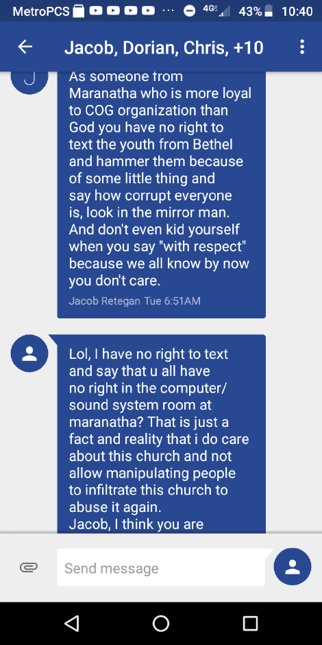 Context: Message threads depict purposefully annoying and harrassing text messages sent from Andy Jack Dimbi to members of the local youth both before and after the leadership of the Maranatha Romanian Church of God leadership was dissolved, and Ioan (Ionuc) Retegan openly tore the congregation in two.