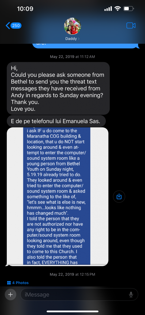 Context: Photos and videos depict text message conversation between Abigail Teodorescu (age 17) and Andy Jack Dimbi (age 30), who became hostile towards Abigail, over the course of time, as Abigail requested of him that he stop attacking the local youth. As depicted, Abigail requested kindly several times that he cease to use her name to attack and slander the youth of the prior leadership and church members that had left the Maranatha Romanian Church of God, to form Bethel Romanian Pentecostal Church, after fraud was discovered and the leadership was dissolved by Church of God. Andy Dimbi becomes hostile towards Abigail Teodorescu, even attacking her eventually, pestering with messages through late hours of the evening, even into very early morning (i.e. 4am).