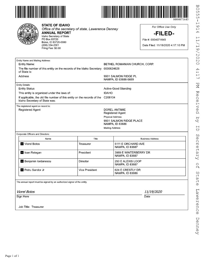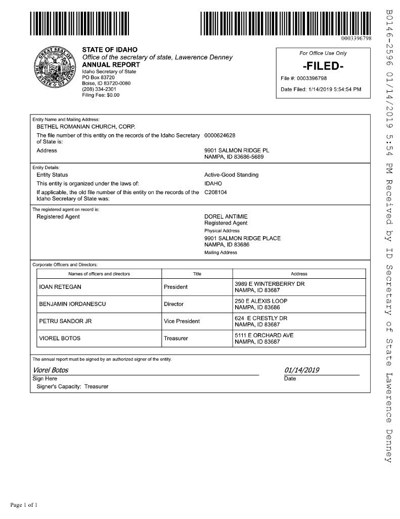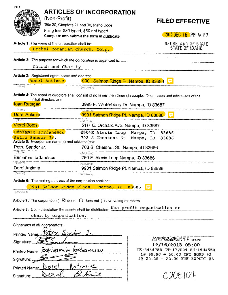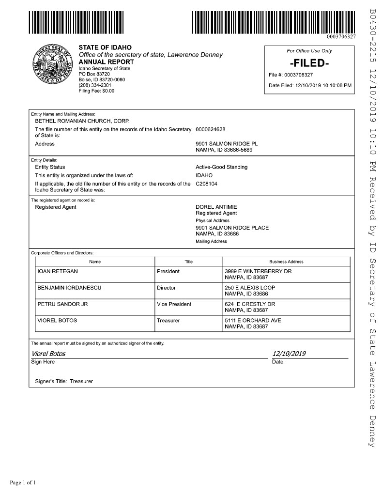 The individuals aforementioned had previously visited the government of the state of Idaho and opened a new church entity on December 16, 2015 (as documented in the organization’s Articles of Incorporation), under the name of Bethel Romanian Church. They listed the main address of the new entity as the home address of their deacon, Dorel Antimie. They also began depositing the tithe money accumulated within the Maranatha Romanian Church of God building into the Bethel Romanian Church bank fund (which they also subsequently opened).