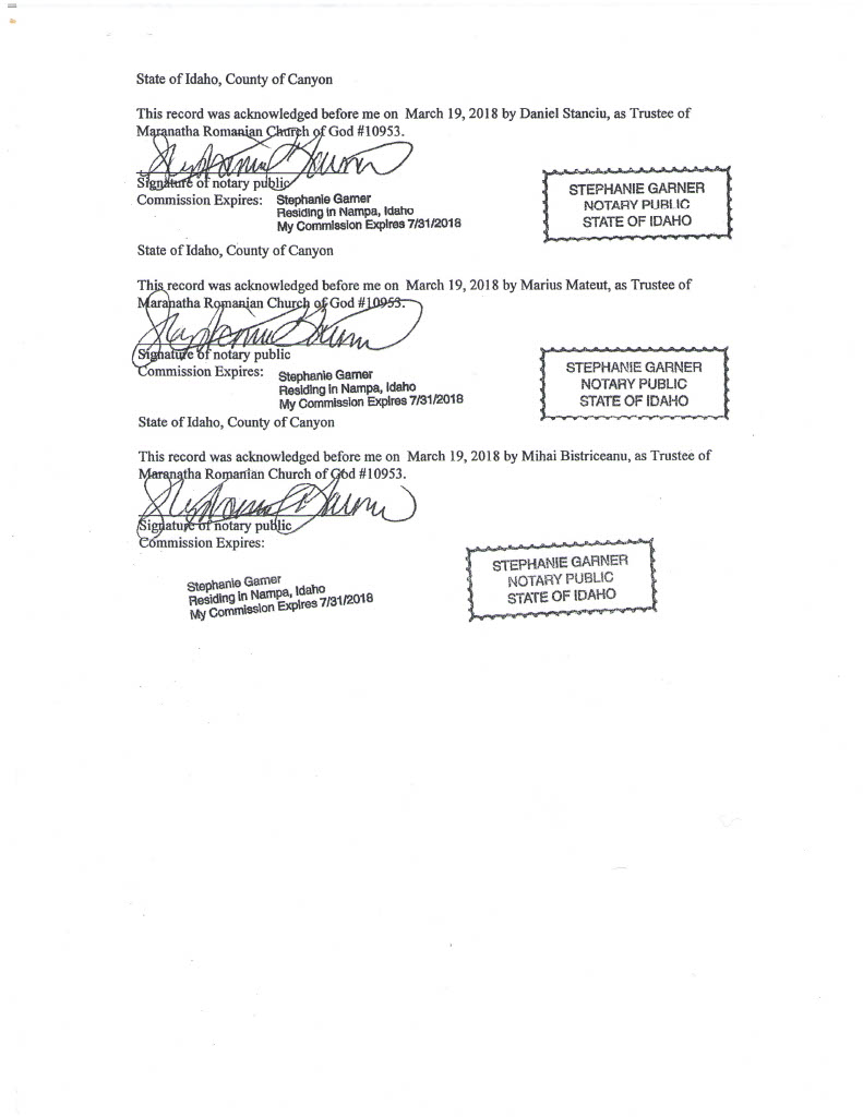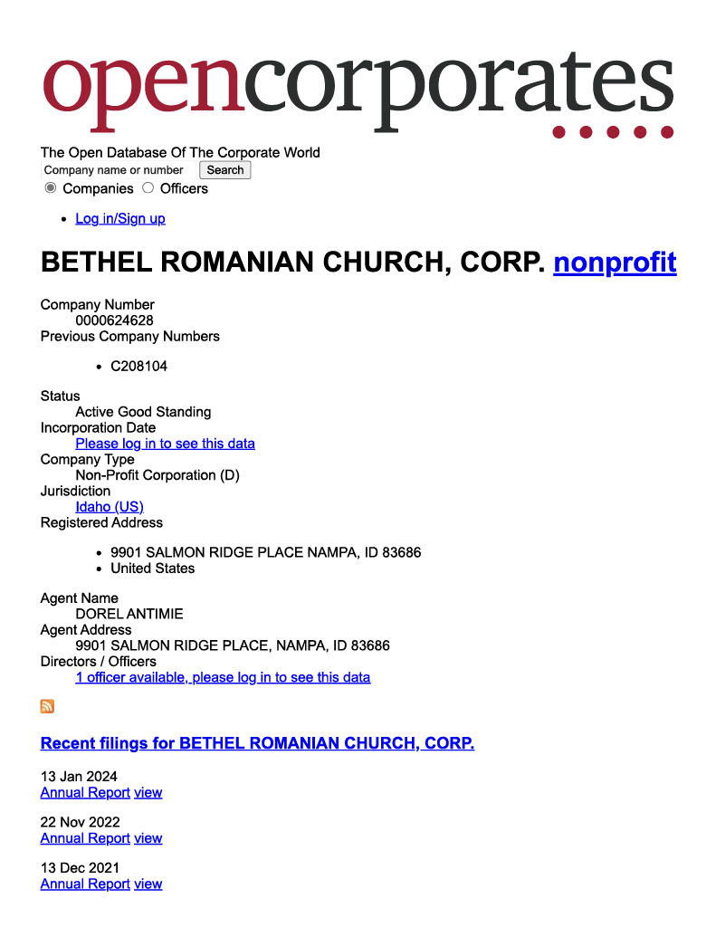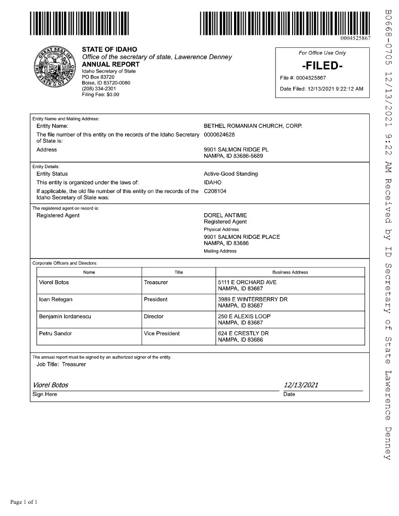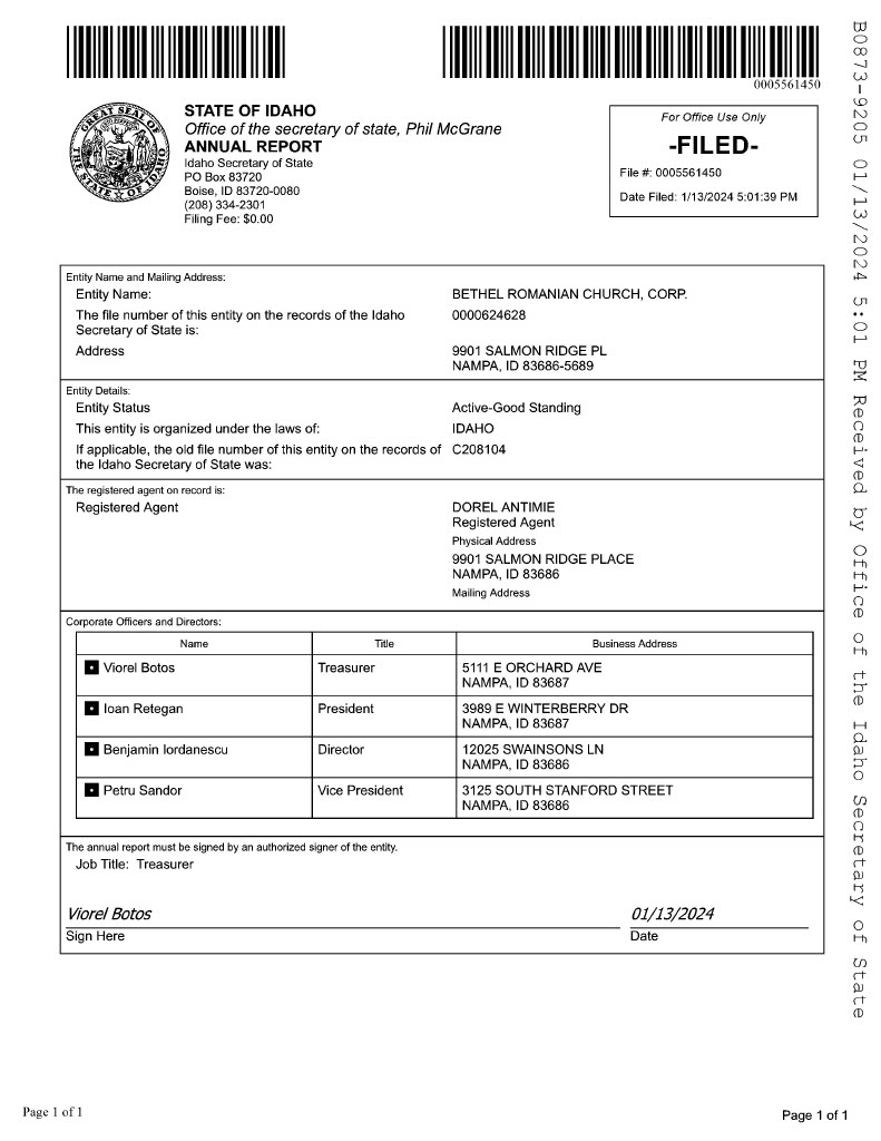 The individuals aforementioned had previously visited the government of the state of Idaho and opened a new church entity on December 16, 2015 (as documented in the organization’s Articles of Incorporation), under the name of Bethel Romanian Church. They listed the main address of the new entity as the home address of their deacon, Dorel Antimie. They also began depositing the tithe money accumulated within the Maranatha Romanian Church of God building into the Bethel Romanian Church bank fund (which they also subsequently opened).