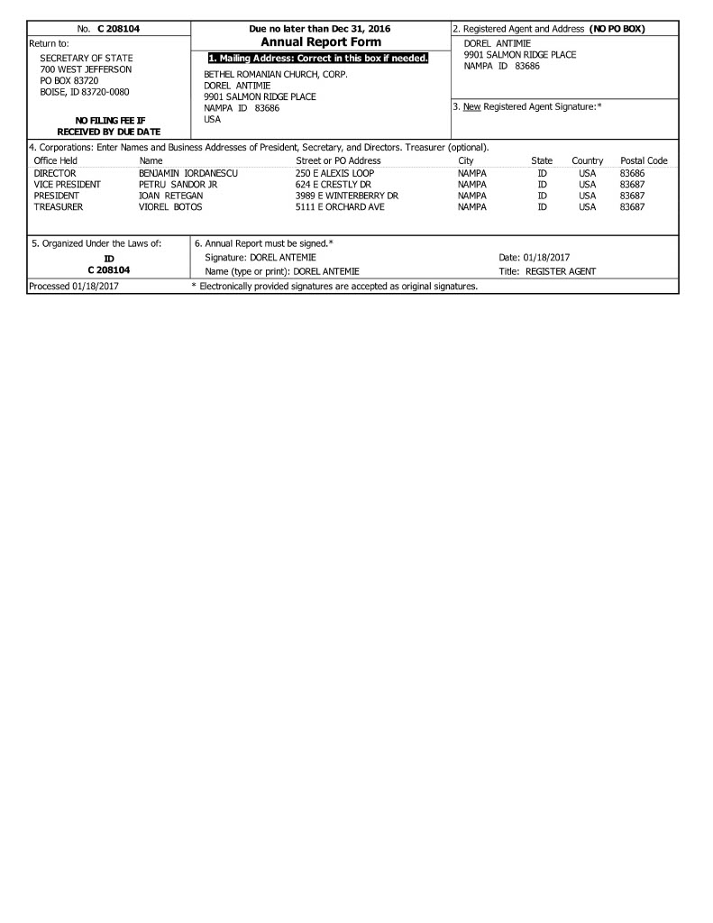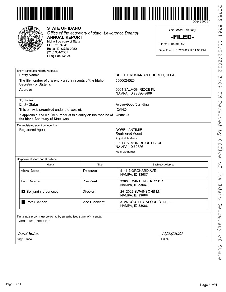Bethel Romanian Church Court Filings and Annual Reports revealing the agents and officers listed on the paperwork to be the same individuals as the leadership of the Maranatha Romanian Church of God, with dates that coincide with a time frame during which they were activating in their roles under Church of God International.