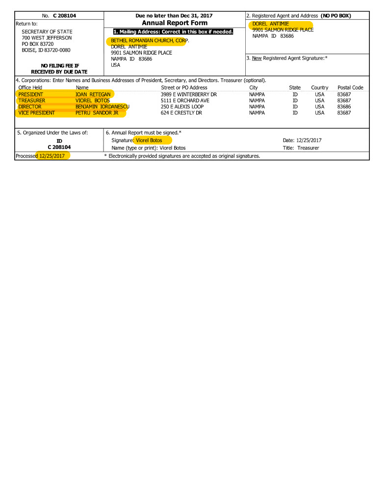 – Why was this legal church entity created on Dec. 16th, 2015 on Dorel Antimie’s personal home address of 9901 Salmon Ridge Pl. Nampa, ID 83686, with the same leaders that are also leading the COG church?