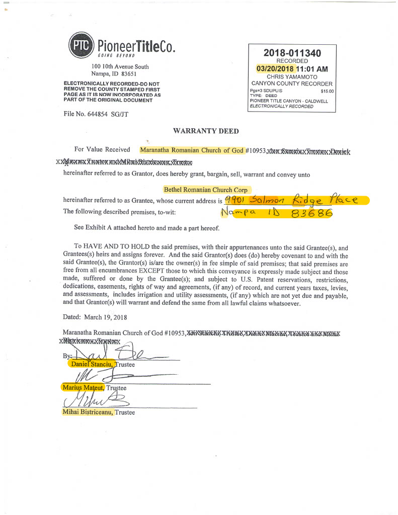 – Did the same leaders of Maranatha COG sell the parcel of land to themselves in the ‘Bethel Romanian Church’ entity that they created & control?