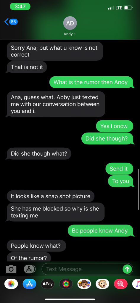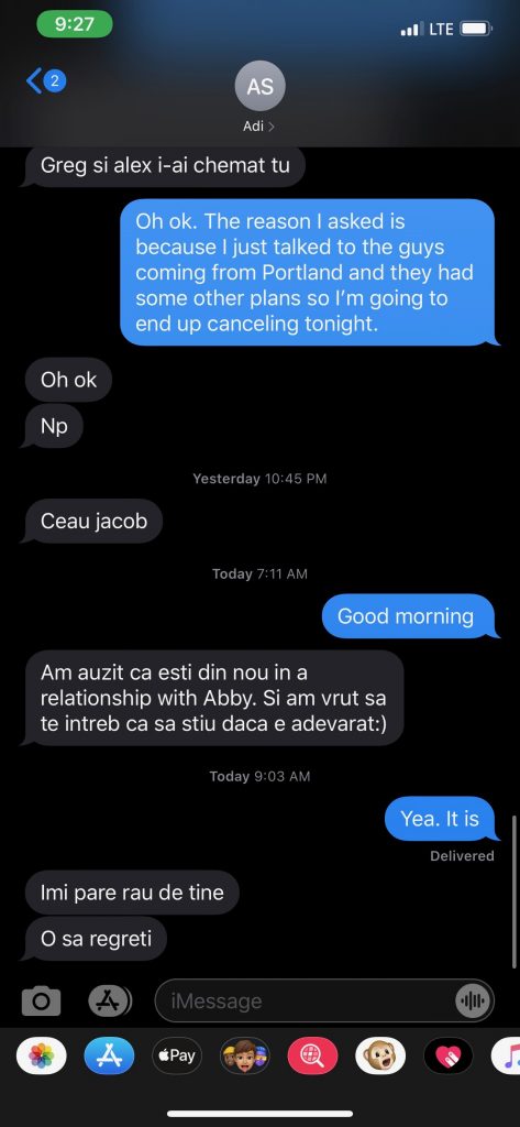 On April 8, 2020, Ana Antimie (Vulcan) reached out to Abigail Teodorescu regarding prying messages she had just received from Andy Jack Dimbi. Andy was inquiring about Abigail, asking Ana to confirm rumors that he claimed to have heard about Abigail “making out with Marcus [Antimie]” and now being engaged to Jacob Retegan. Ana denied the allegations, as she knew they were not true. Marcus Antimie also denied these allegations, as well, as depicted. However, Andy would not allow himself to be deterred and continued pressuring Ana reveal anything she could to somehow create more strife, drama, and further dissension – in an effort to dig up anything he could use against the Teodorescu family (Ovidiu and Mihaela Teodorescu and their children).