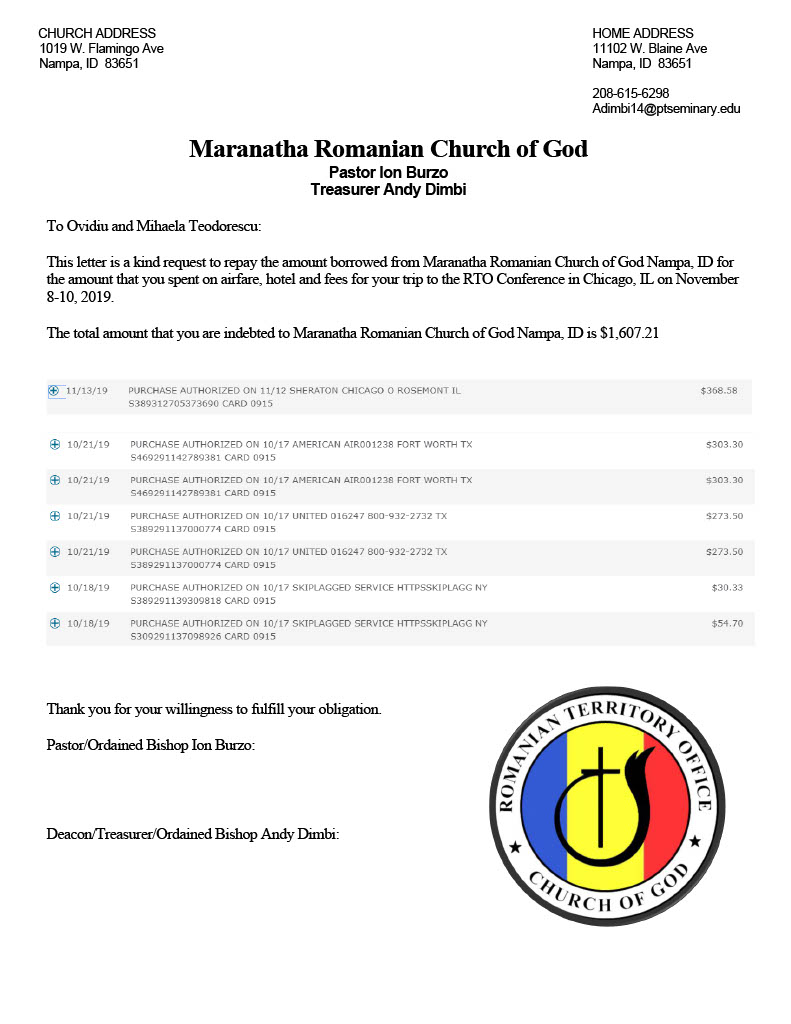 In this letter, Andy Dimbi alleges the family stated they would pay back the funds they utilized to attend the conference (that they were requested to attend in Pastor Ionel Burzo’s absence). This was not true, therefore, Ovidiu Teodorescu contacted Pastor Ionel Burzo to inquire as to whether he was aware and had approved that Andy Dimbi forward this document to him, while utilizing the official COG Romanian Territory Office Seal (which Andy Dimbi did not represent).
